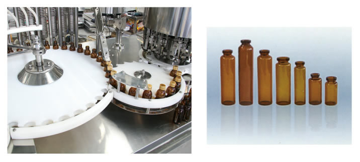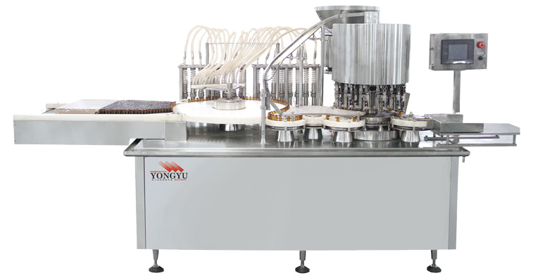 该线采用触摸屏动态显示操作,PLC程序控制;主机变频调速。瓶子先经超声波粗洗,后由特制瓶斗传输,经过九组工位内外压力冲洗后,进入高温隧道烘箱内灭菌、然后转入灌封机,由渐进式拦边网带进瓶、陶瓷泵跟踪灌装、柔性单刀或三刀滚压跟踪轧盖、凸轮式收瓶装置等先进工序,自动化程度高。是口服液高产量新型的理想设备。
