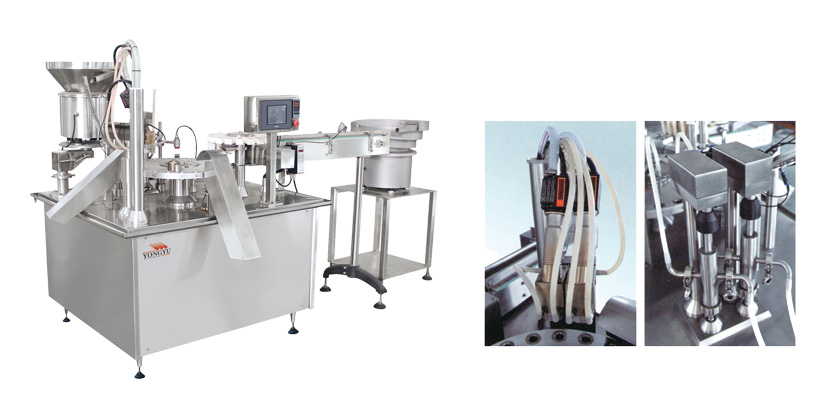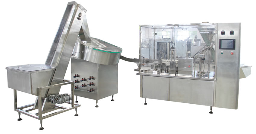 本机组符合“cGMP”要求,适用于新型易折塑料瓶的灌装与热封口,是参照国外同类机型更新设计而成。 本机通过自动上瓶、底部灌装、自动上盖、热熔式底部封口、机械手送出瓶等一系列特制工序后完成灌封 工作,是国内口服液灌装生产的理想设备。
