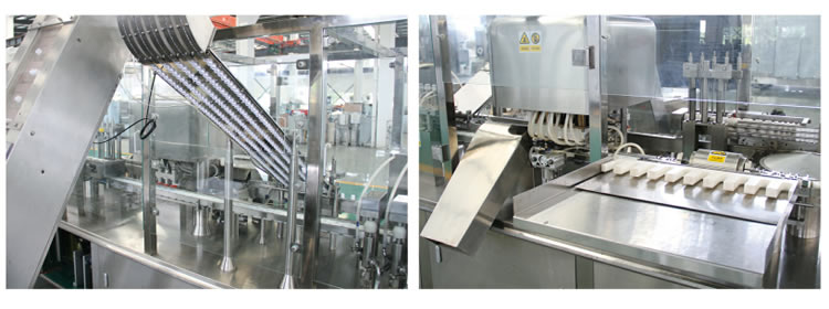 本机通过自动上瓶、底部灌装、自动上盖、热熔式底部封口、气动手指夹送出瓶等一系列特制工序完成灌封工作,可做为国内口服液灌装生产理想设备。